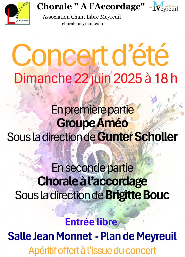 Le concert d’été, de notre association Chant libre Meyreuil, viendra clôturer l’année de notre activité 2024/2025.