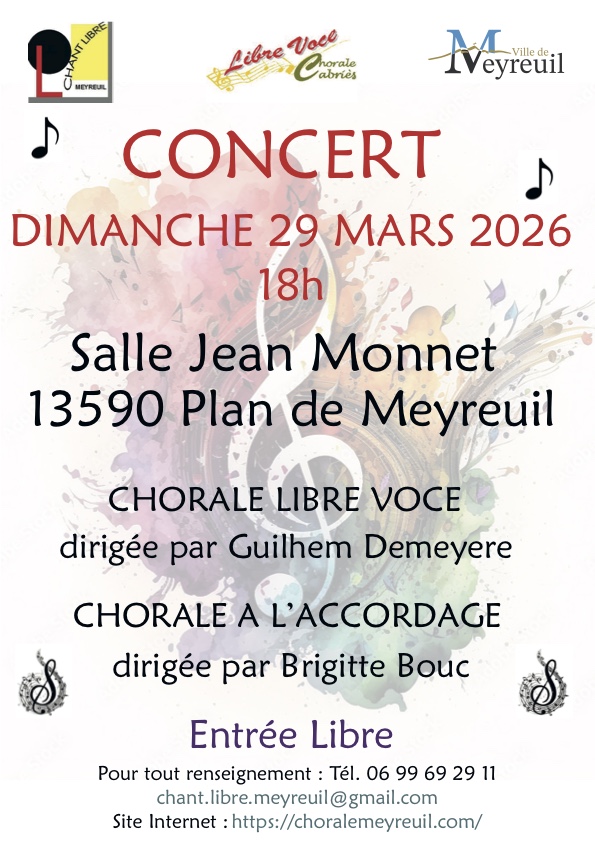 Nous vous annonçons notre concert de printemps qui se tiendra le dimanche 29 mars à 18h00 à la salle Jean Monnet à Meyreuil.